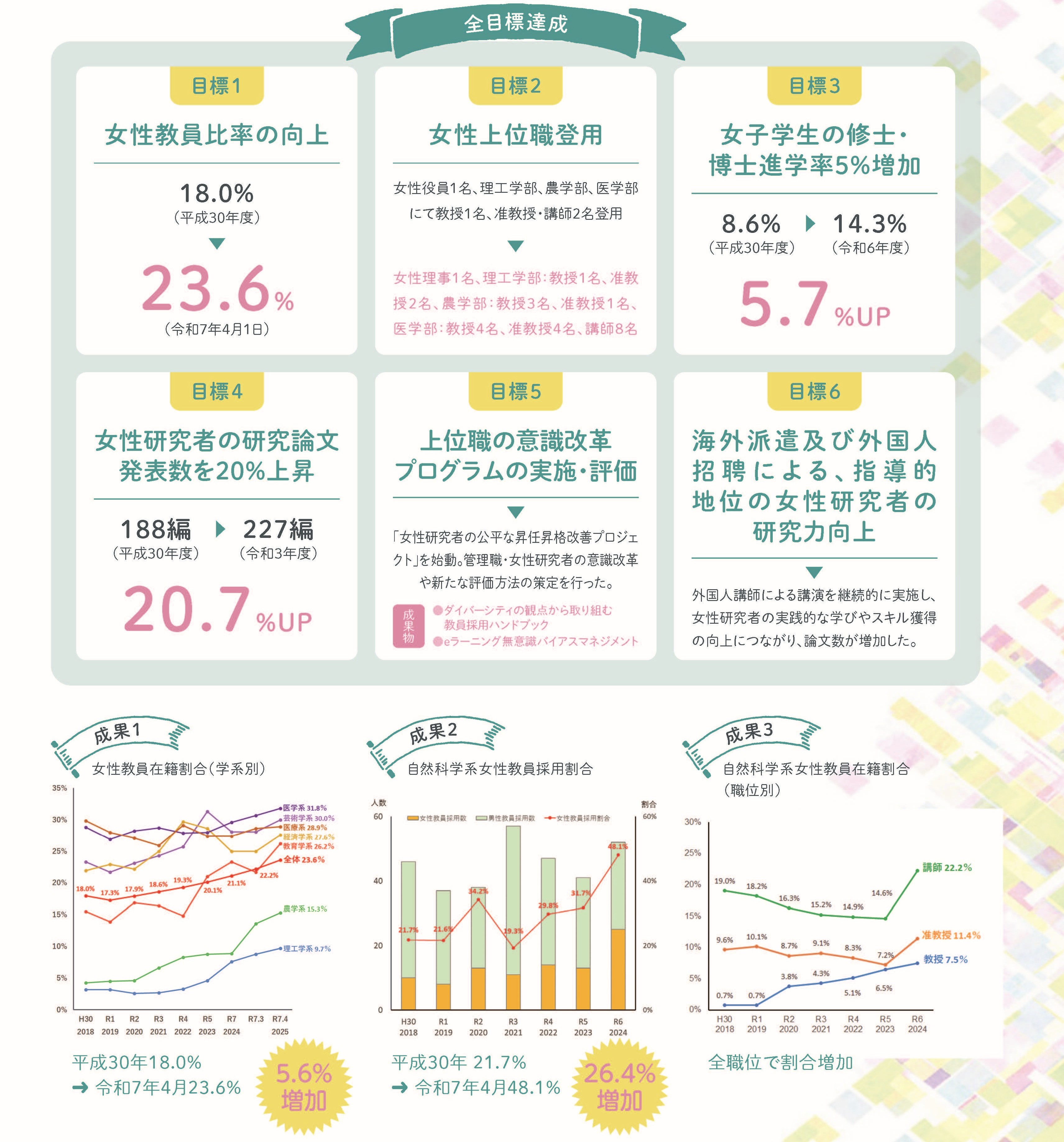 中間評価では、6つの目標の数値改善が十分に進まずB評価でしたが、最終年度には6つ全ての目標を達成し、A評価(所期の計画と同等の取組が行われている)を獲得することが出来ました。これは、学長のリーダーシップのもと、関係者のみなさまのご協力により得られた成果です。心より感謝申し上げます。